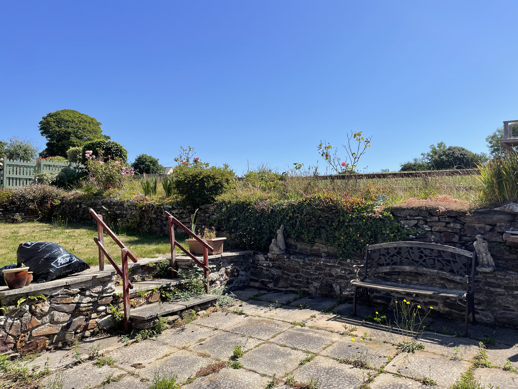 The rear garden features a raised level lawn and a paved patio area ideal for outdoor dining or relaxation. A charming stone wall forms the rear boundary, separating the garden from the Wooldown beyond and enhancing the sense of privacy and rural outlook.