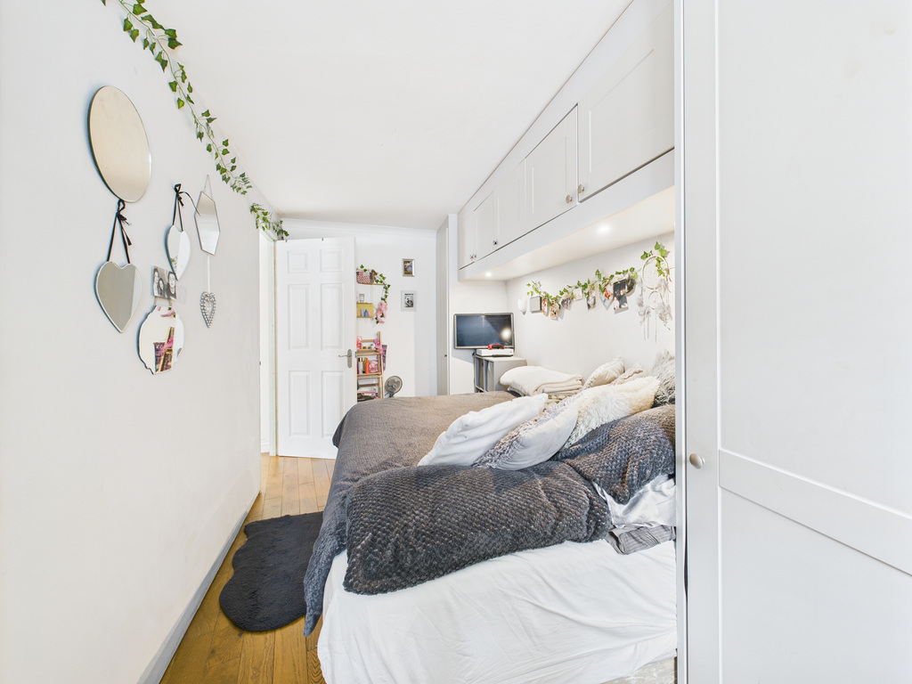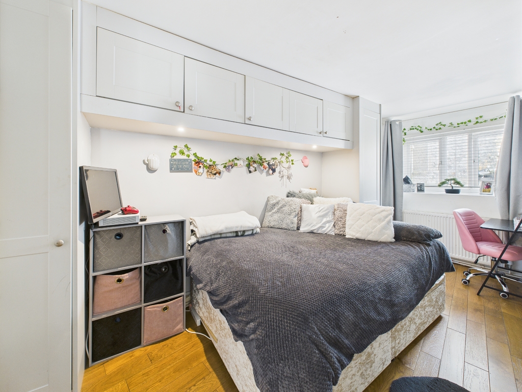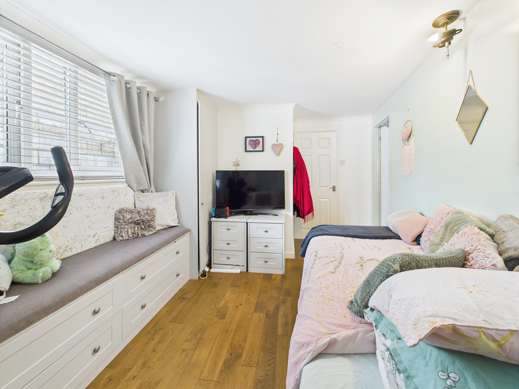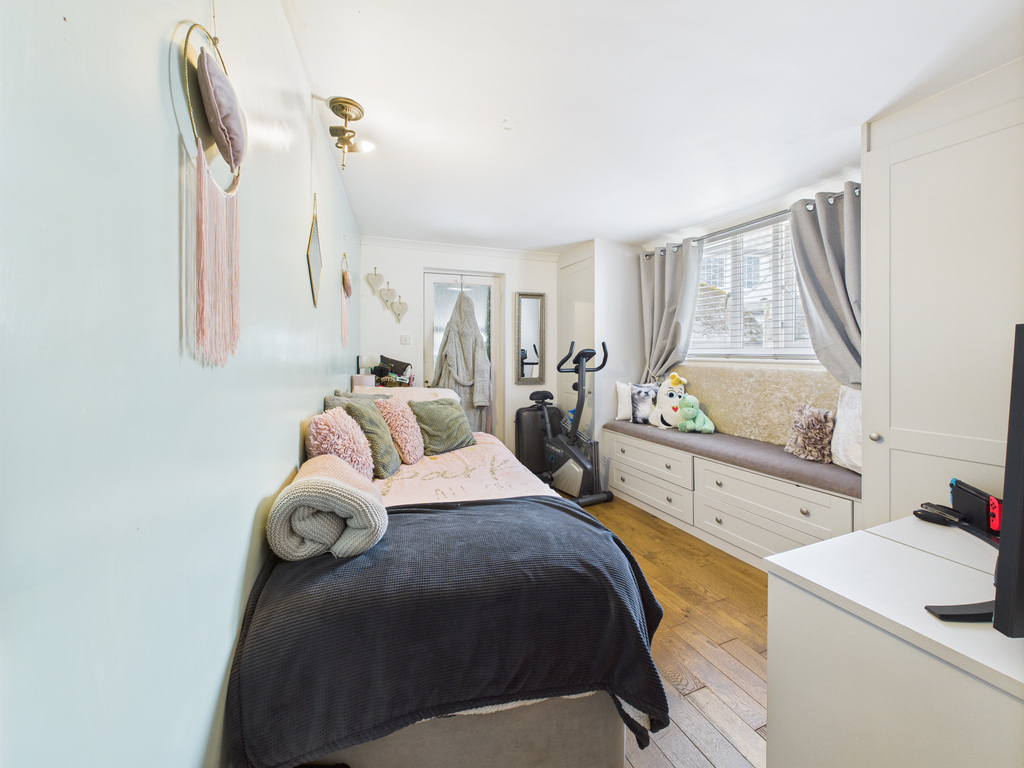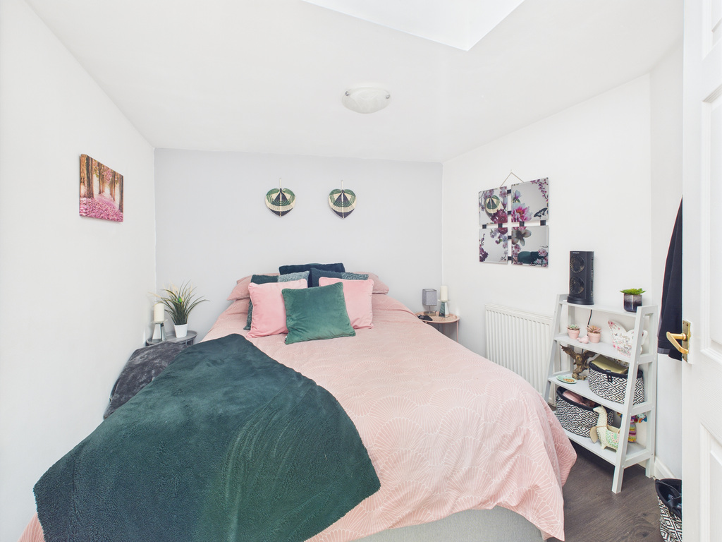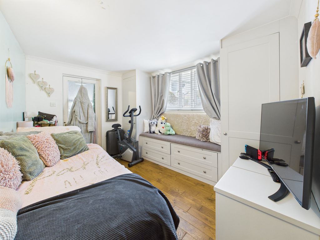 A door off the living room leads into a hallway, providing access to the principal double bedroom, which is beautifully enhanced by a skylight filling the space with natural light. The second bedroom features built-in storage and a window overlooking the rear of the property, offering a quiet and comfortable space. The third bedroom offers generous built-in storage and features a charming window seat with additional storage beneath—ideal for both practicality and relaxation. A door from this room leads into the utility area, where steps descend to a private rear courtyard, perfect for enjoying some outdoor space.
