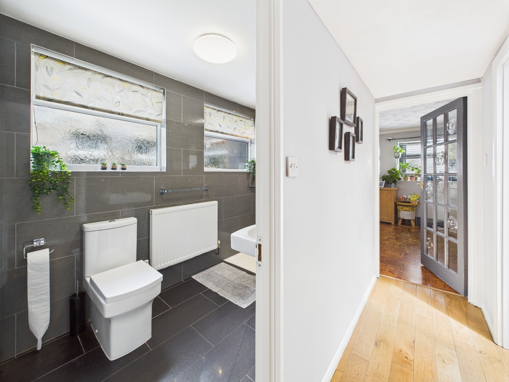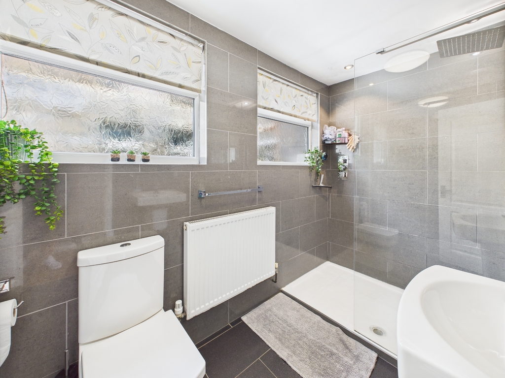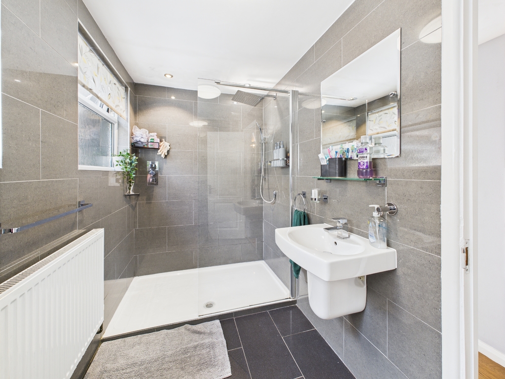 The family bathroom is a bright and spacious tiled room, featuring a walk-in shower, toilet, washbasin, and a large airing cupboard with sliding doors—providing excellent additional storage.