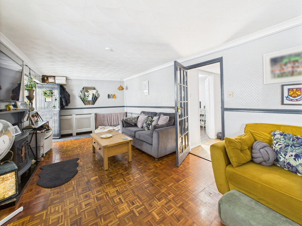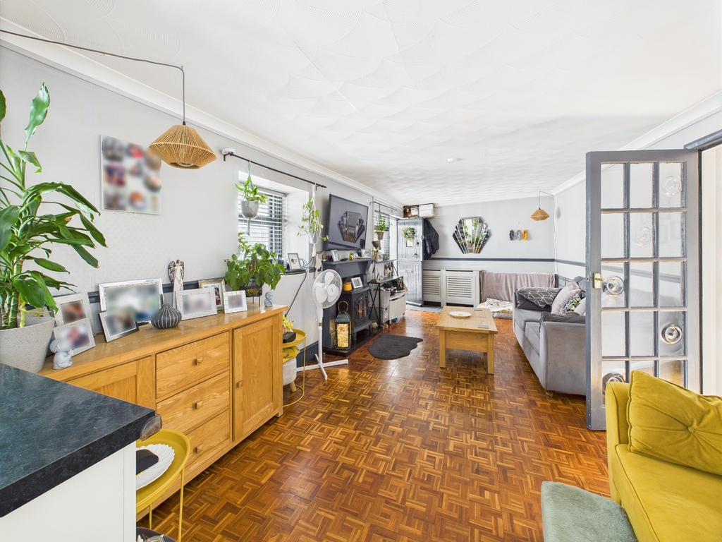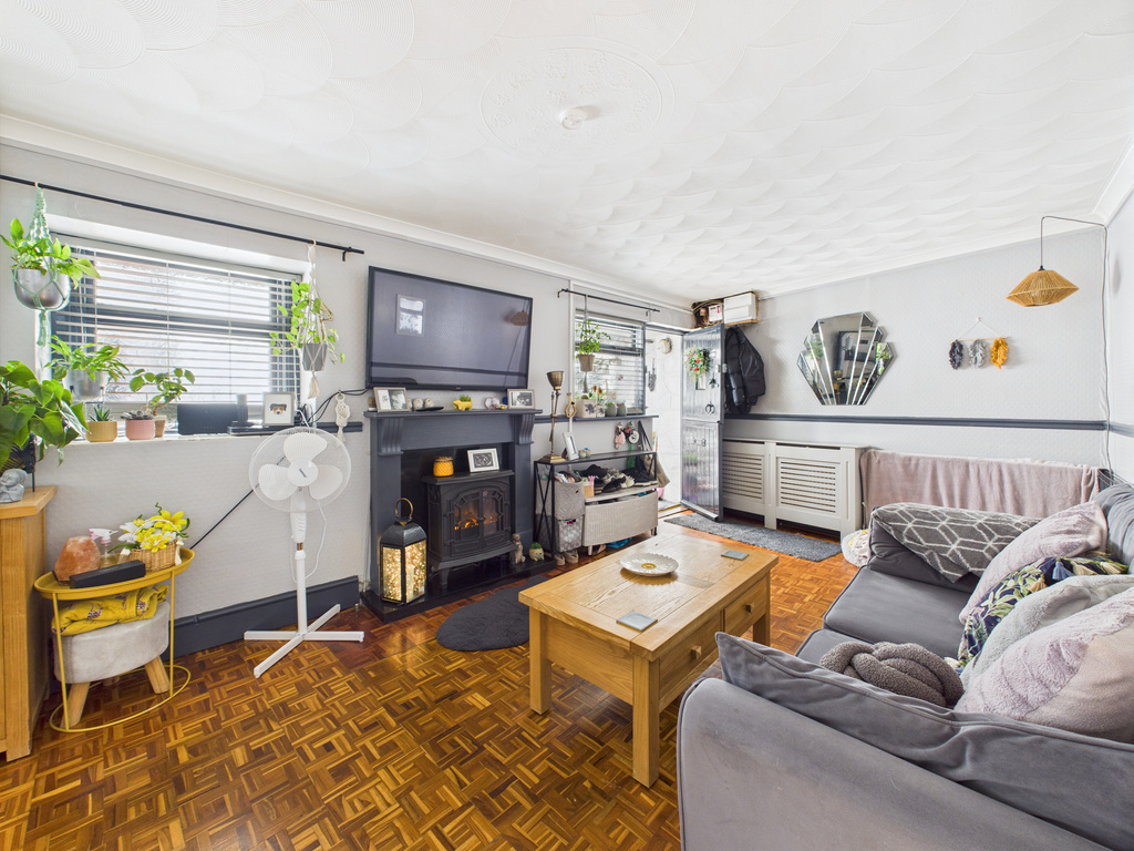 The flat is accessed via a set of steps leading to the front door, which opens into a welcoming living room—the heart of the home. A feature fireplace takes centre stage, complemented by stylish parquet wooden flooring that adds warmth and character.