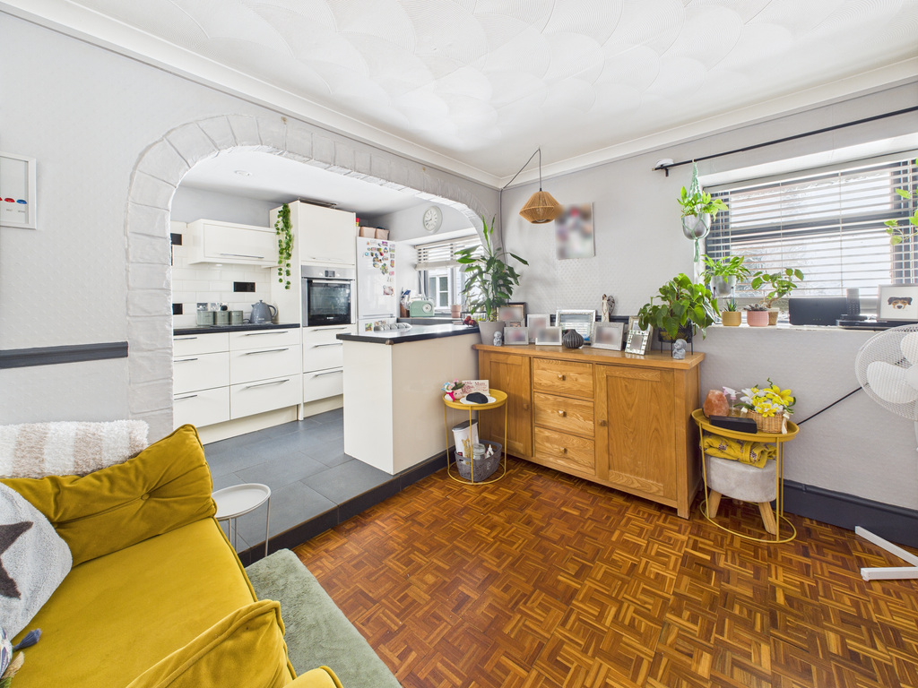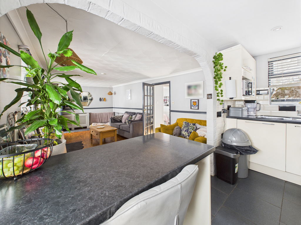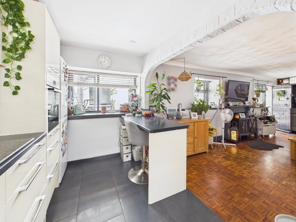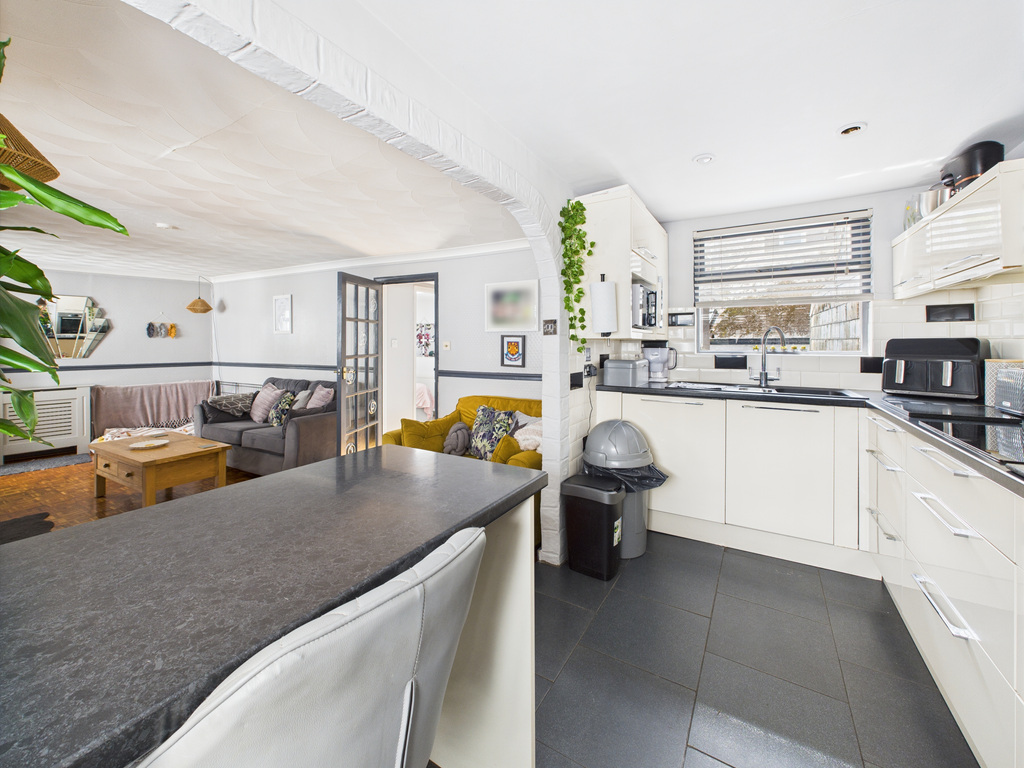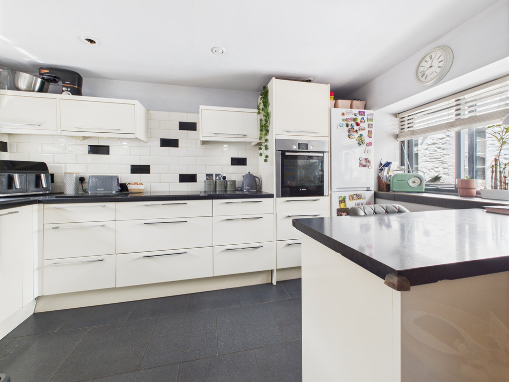 Flowing seamlessly from the living area is a modern, well-equipped kitchen. It features tiled floors and walls, along with an abundance of white upper and lower cabinets for ample storage. The kitchen includes a built-in oven, hob, and extractor fan, as well as space for a fridge freezer. A breakfast bar provides a convenient dining option, making the space both functional and sociable.