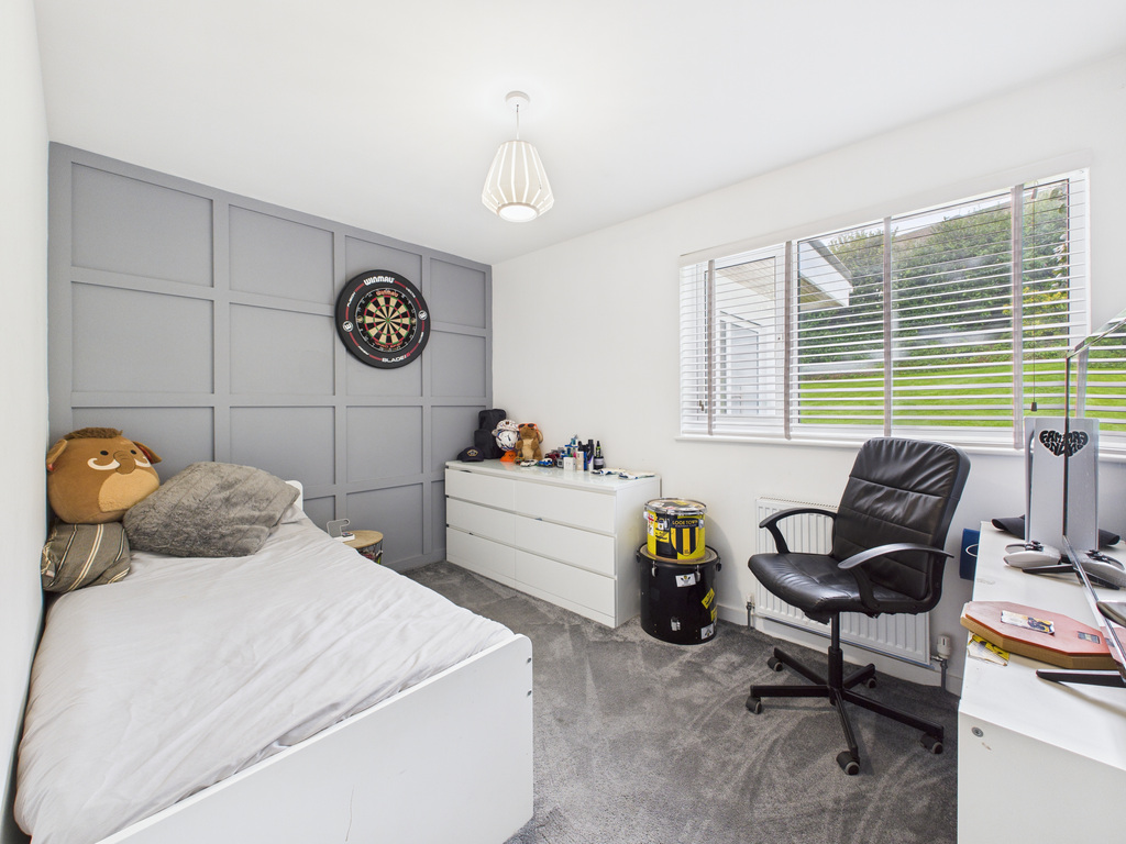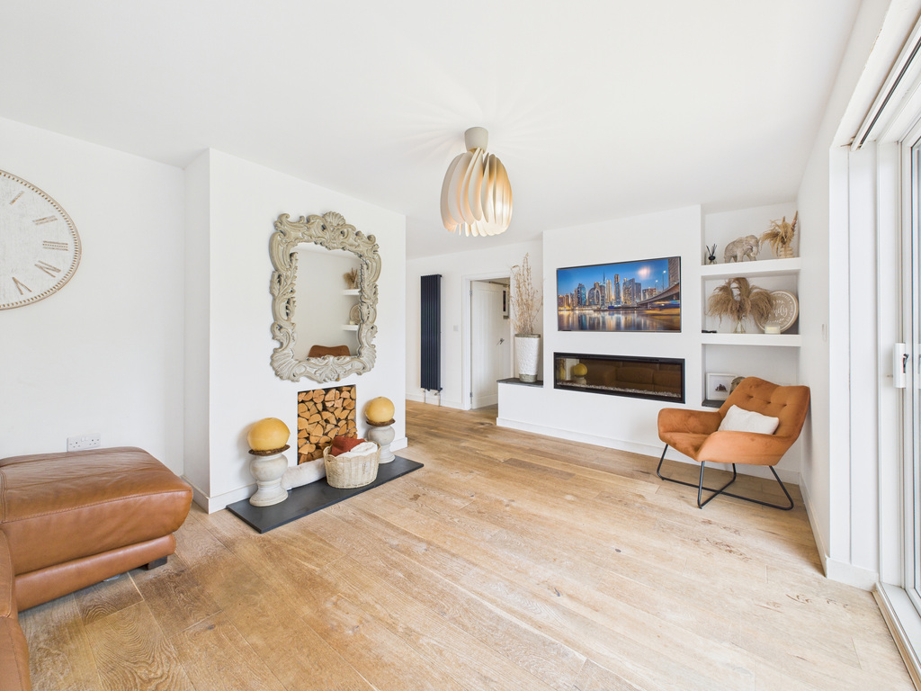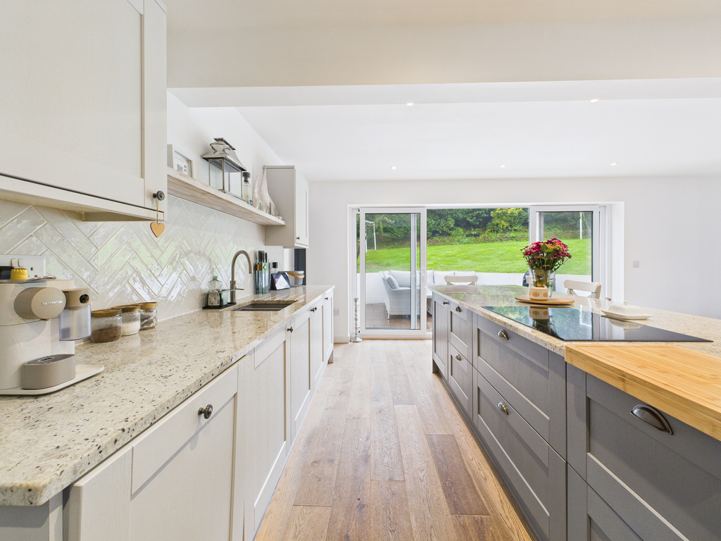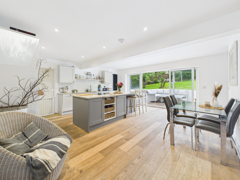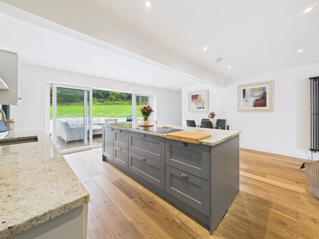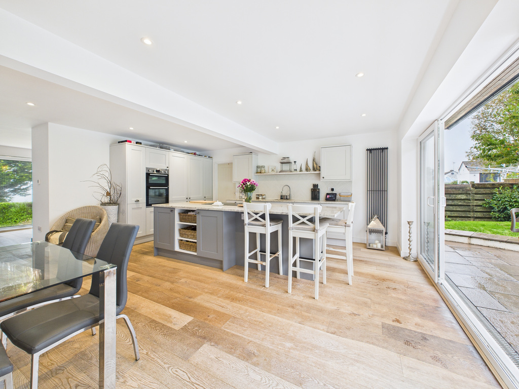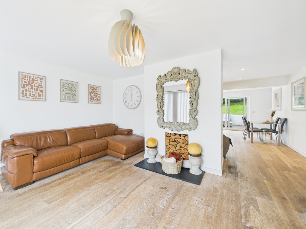 On entering the property, you step into a welcoming porch which leads through to the main living areas. At the heart of the home is the impressive kitchen/diner, complete with a central island and fully integrated appliances and quooker hot water tap. This light-filled space opens through large sliding patio doors to the rear patio and enclosed garden, creating an ideal setting for entertaining or relaxed everyday living. Flowing from the kitchen/diner is the living room, a beautifully arranged space with an ornamental fireplace, inset feature fire with shelving to either side. Sliding patio doors extend the room out to the front decked terrace and garden, enhancing the indoor–outdoor lifestyle with countryside views extending over to Trenant Woods.