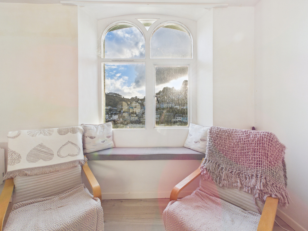 The heart of the home is the bright open-plan sitting room, kitchen and dining area. The kitchen is fitted with a range of wall and base units with contrasting solid wood work surfaces, an inset sink with waste disposal unit, electric cooker with extractor hood, space for a washer/dryer and refrigerator. A breakfast bar with storage separates the kitchen from the sitting area. Feature arched windows provide character and frame attractive views across the harbour towards West Looe, while a double glazed door opens onto the private terrace.