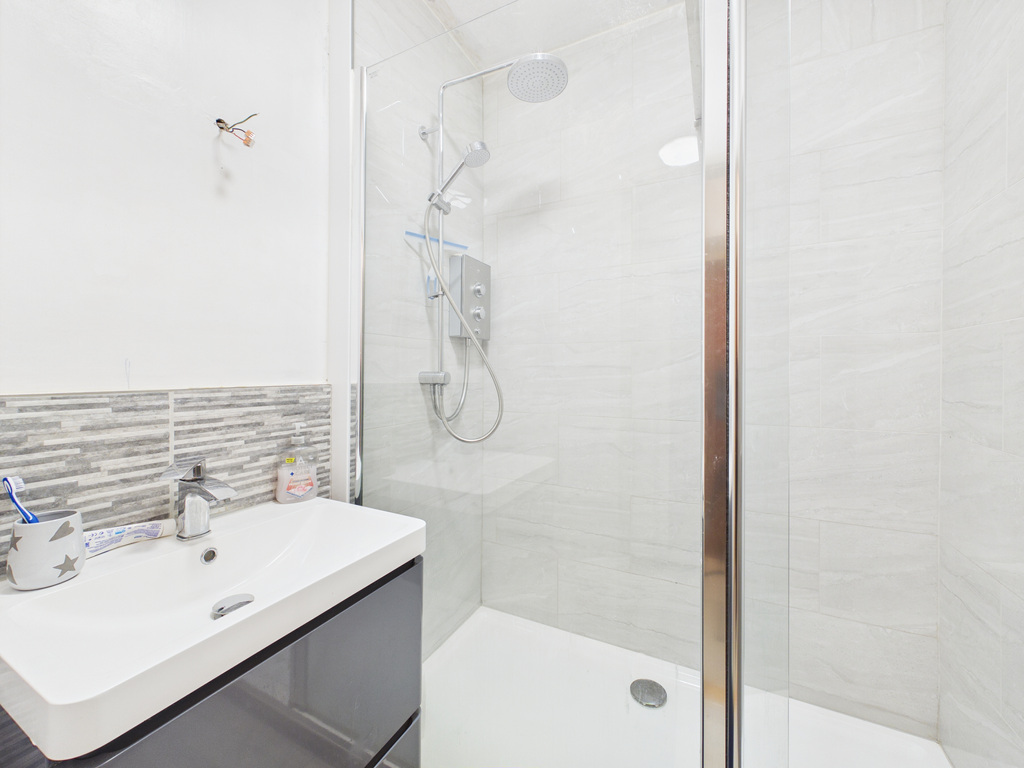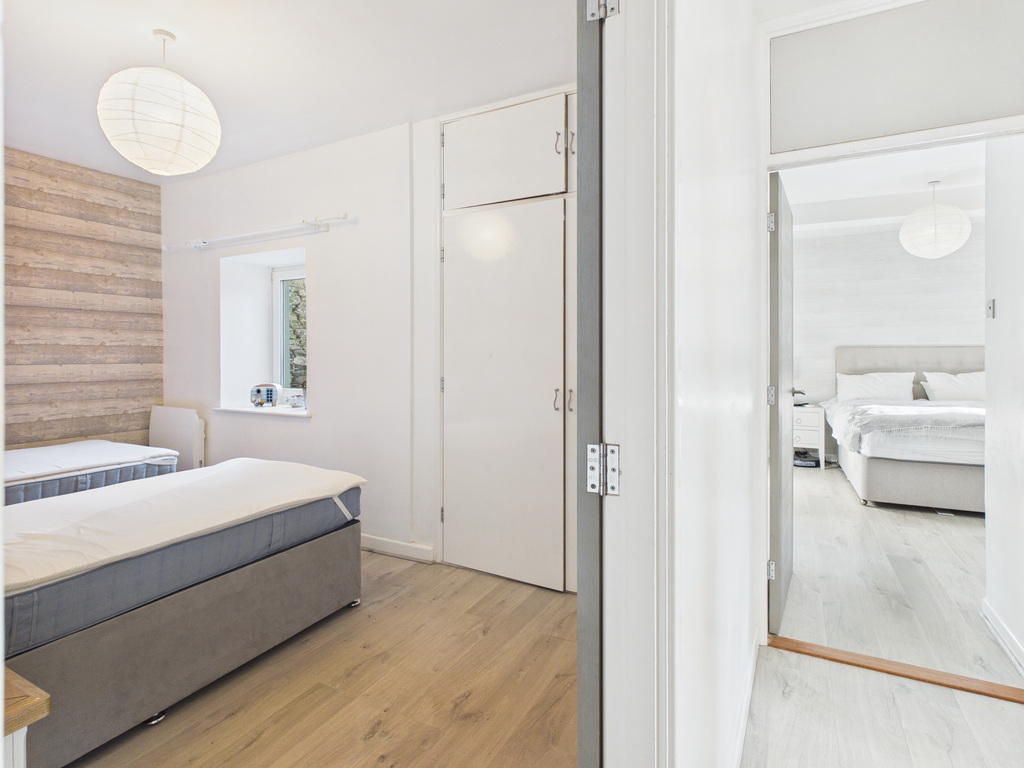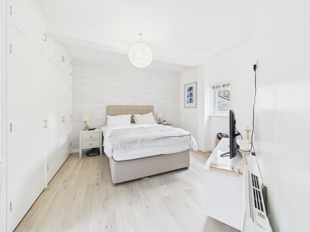 There are two bedrooms, both with built-in wardrobes and additional storage. The principal bedroom enjoys a dual aspect with a feature arched window and views across the surrounding rooftops.