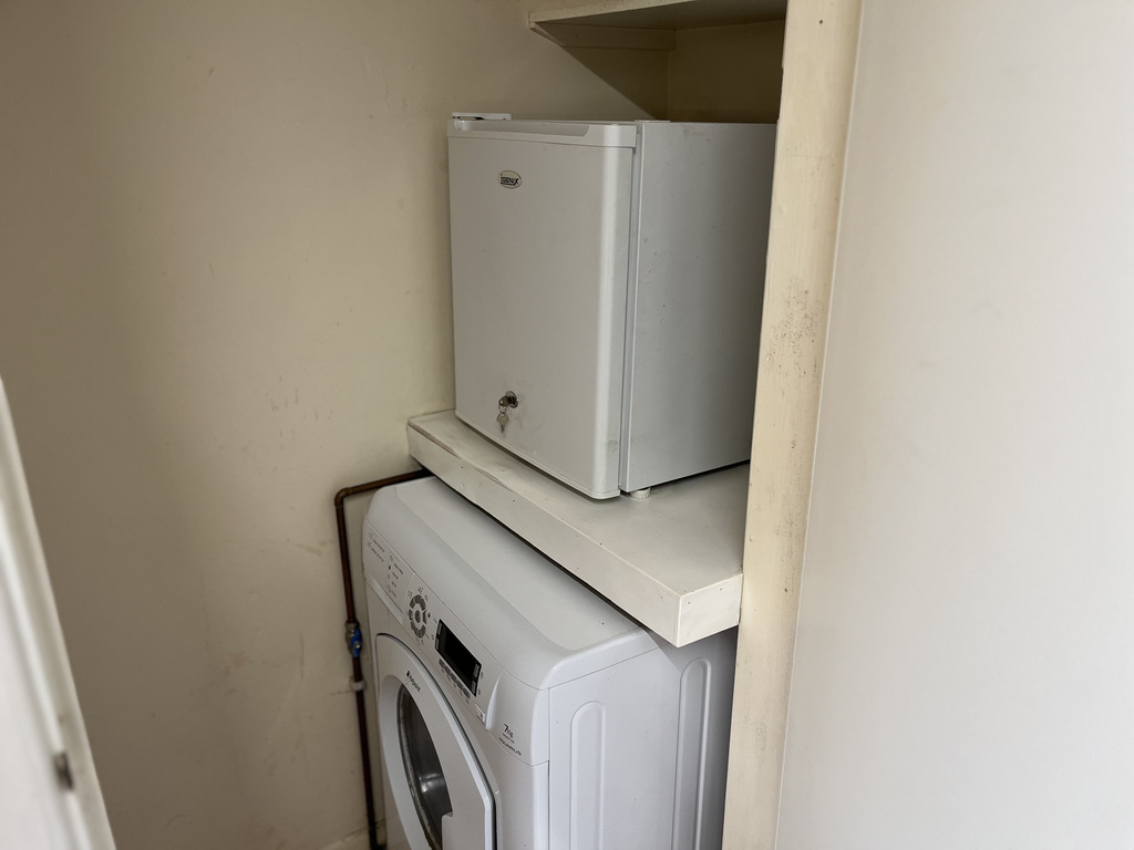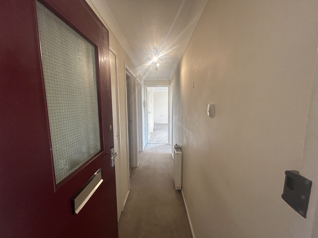 The hallway provides access to all rooms, including an airing cupboard that houses plumbing for a washing machine.