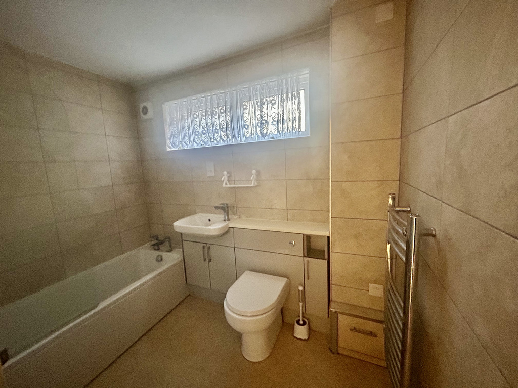 The bathroom is fully tiled and features a panelled bath with shower over, pedestal wash hand basin, and low-level WC.