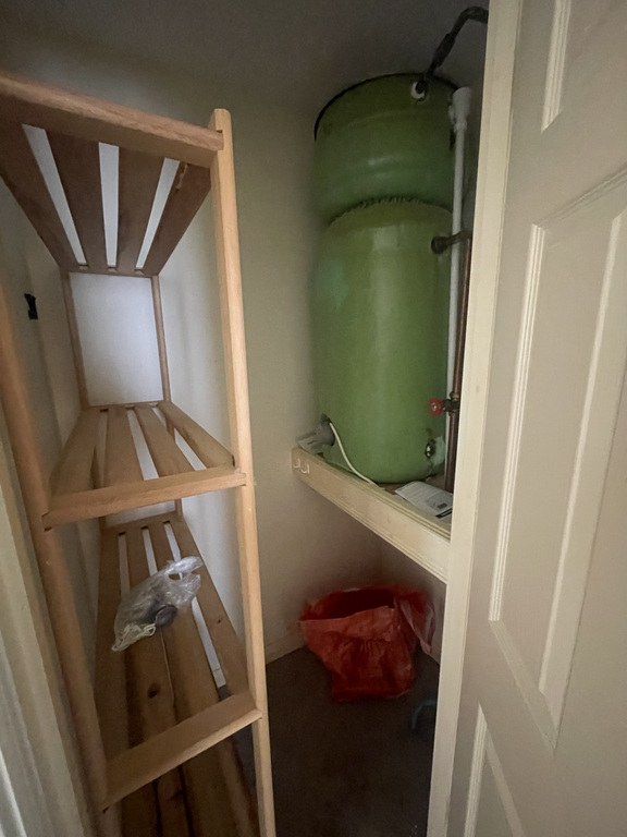 A practical airing/storage cupboard housing the boiler, with ample room for towels, linens, and household essentials.