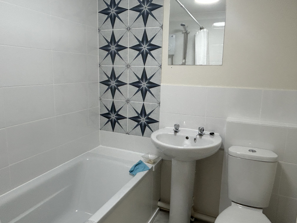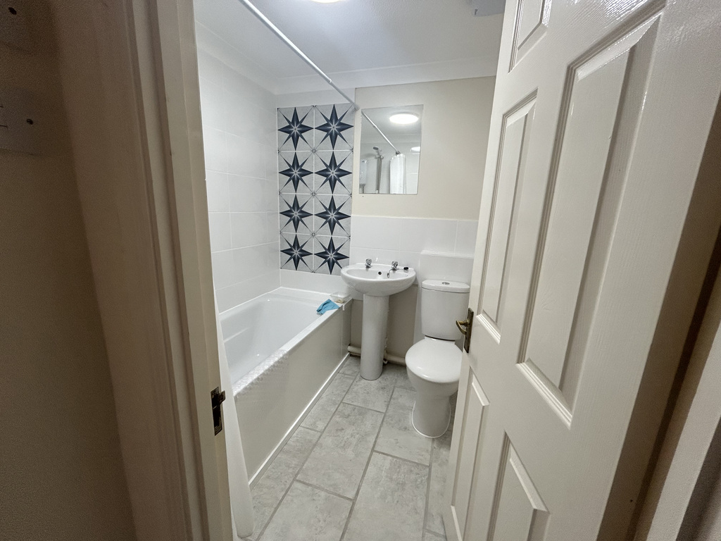 This partially tiled, the bathroom has recently refurbished and comprises a panelled bath with shower over, a pedestal washbasin, and a low-level W/C.