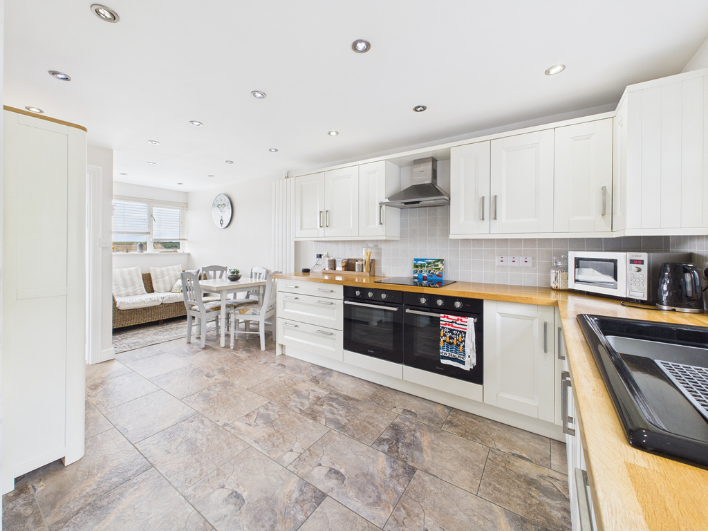 At the heart of the home is the spacious kitchen/breakfast room, fitted with a range of modern units and ample worktop space, along with room for a dining table and a cosy seating area. This is a true hub for family life, with a light, airy atmosphere enhanced by neutral décor and recessed spot lighting.
