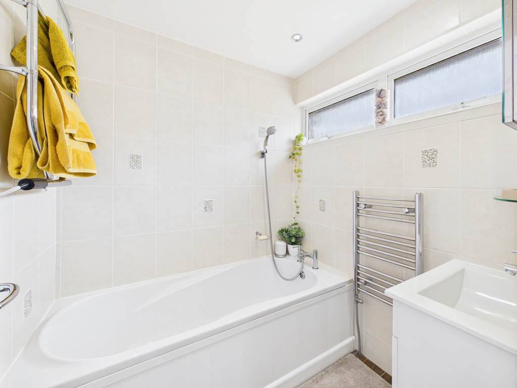 The property is set back from the road and opens into a bright hallway leading to two generous reception rooms. The main living room is flooded with natural light from large windows, creating a warm and inviting space to relax or entertain. A second reception room offers flexibility – ideal as a formal dining room, snug, or playroom.