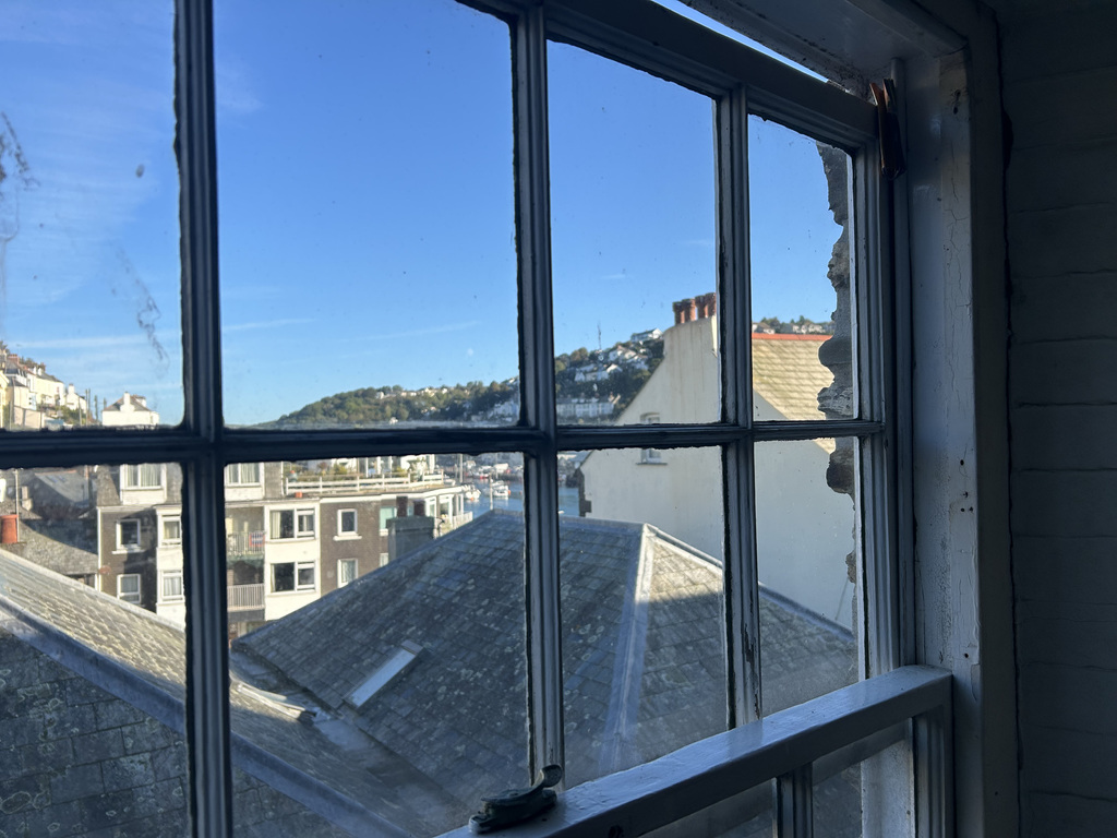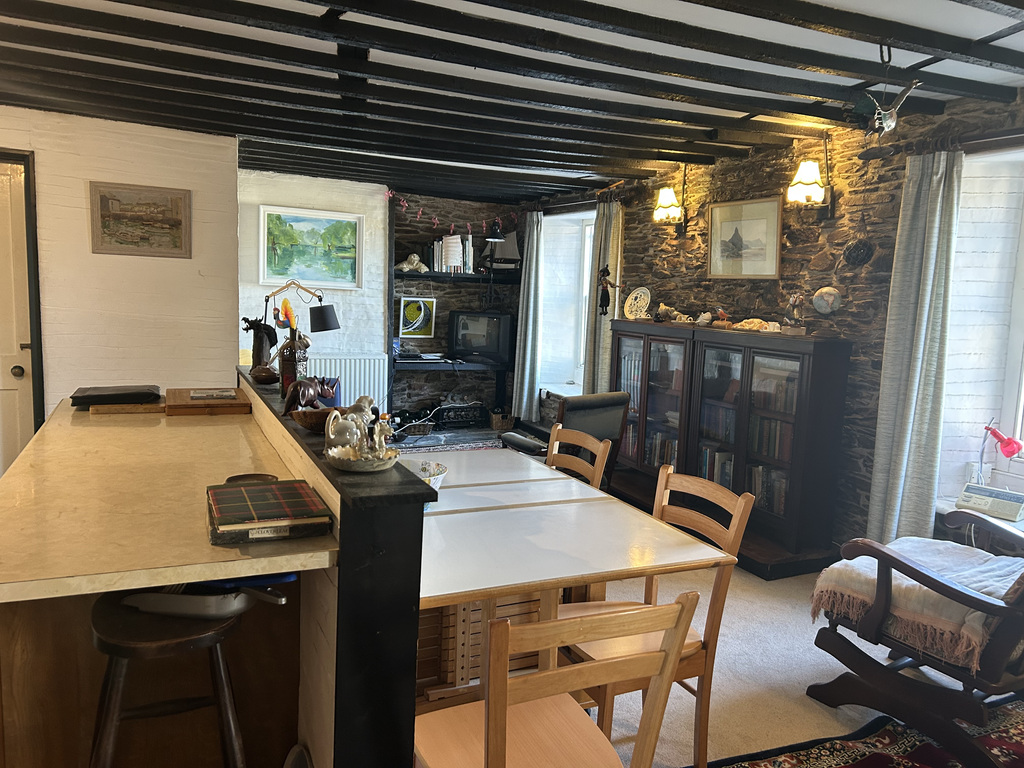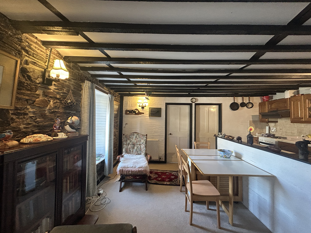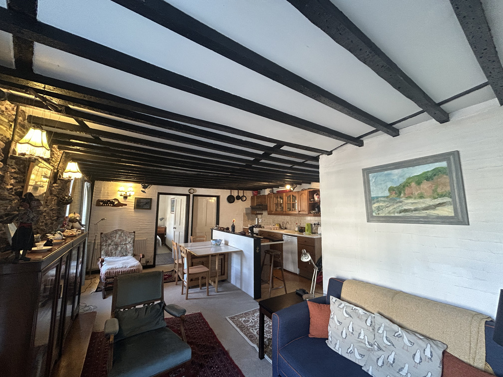 Through the front door, you are welcomed into an airy open-plan kitchen, lounge, and dining area that provides a comfortable and sociable living space. Double sash windows flood the room with natural light and offer views across the surrounding rooftops with a glimpse of Looe Harbour. Spanning the full width of the property, the room is full of character, featuring original wooden beams, sash windows with window seats, exposed brickwork, and areas of natural stone flooring. The kitchen is fitted with a sink, wooden-fronted upper and lower units with complementary work surfaces, and has space for a fridge and electric oven with an overhead extractor fan.