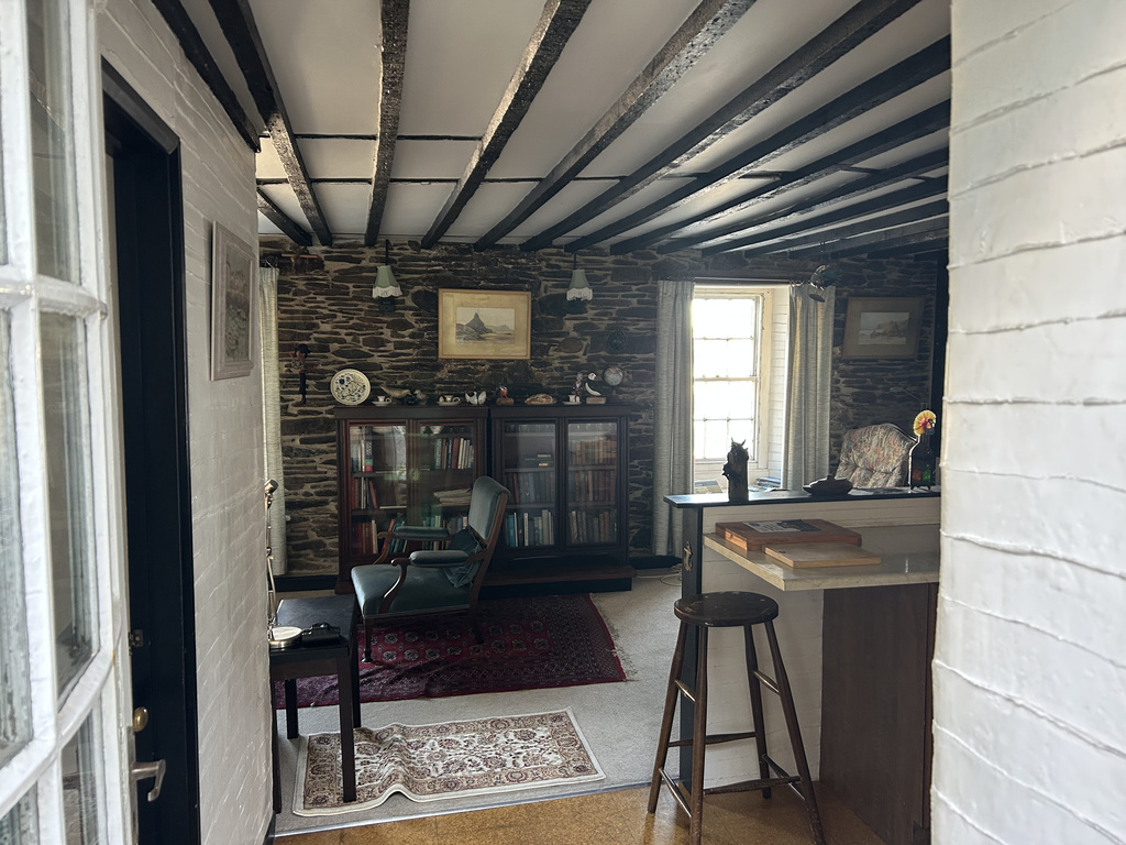 Island House Flat is tucked away just off Church Street, set slightly up a slope on Hannafore Lane, to the rear of the Island House building. The property enjoys its own private entrance, approached via a couple of steps leading to a small patio area — the perfect spot for a chair to sit and watch the world go by.