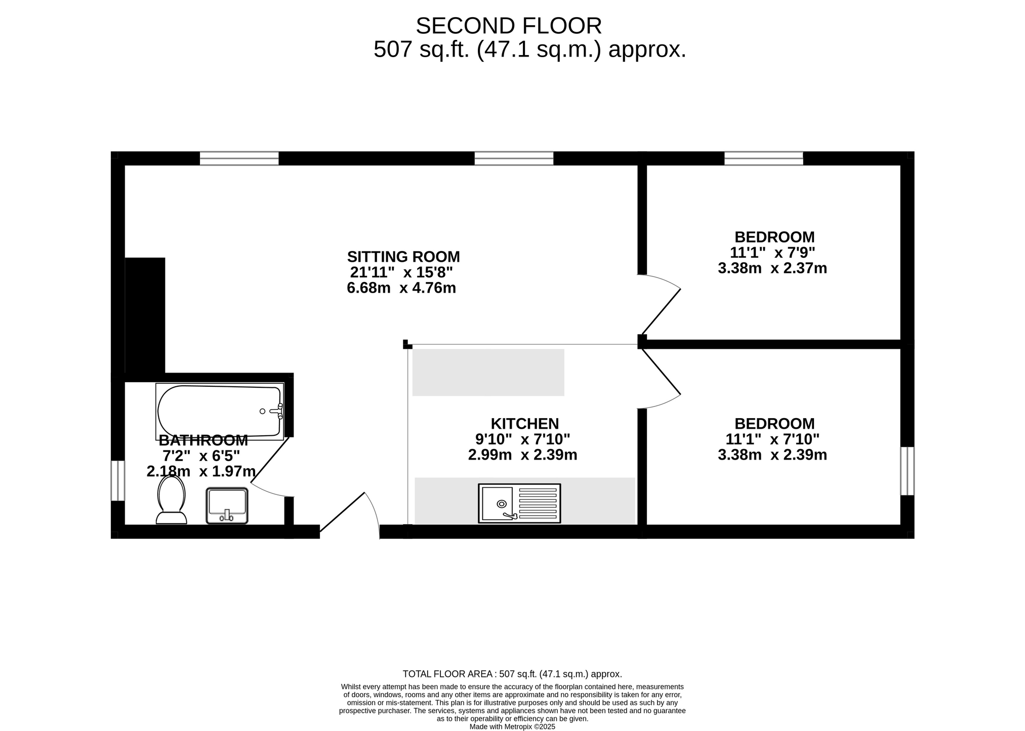 The property offers two bedrooms, both carpeted for comfort. The main bedroom is a double, while the second is a versatile small double or single, with space for a wardrobe or additional furnishings.