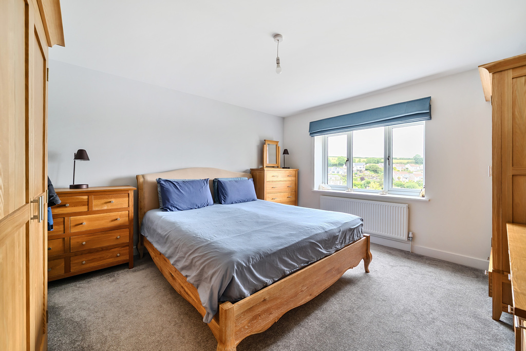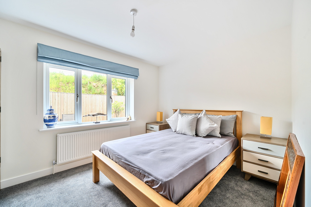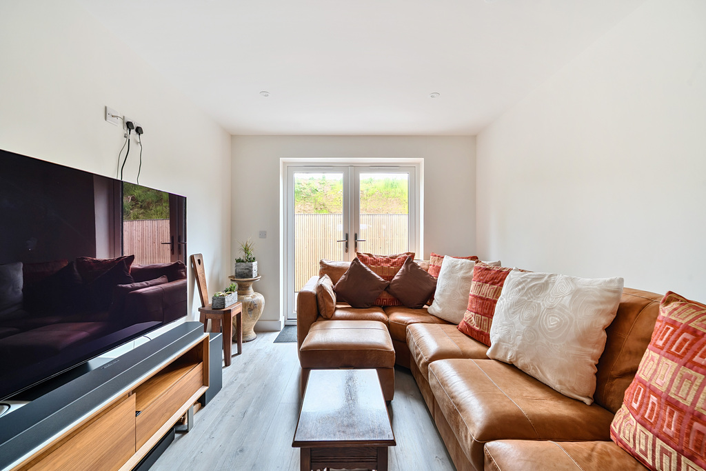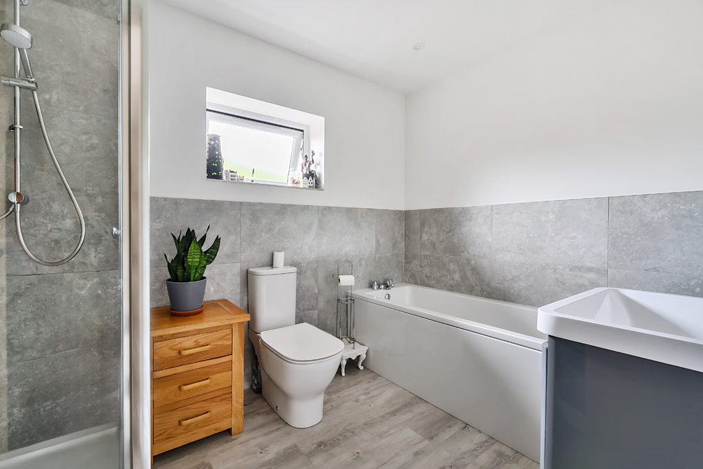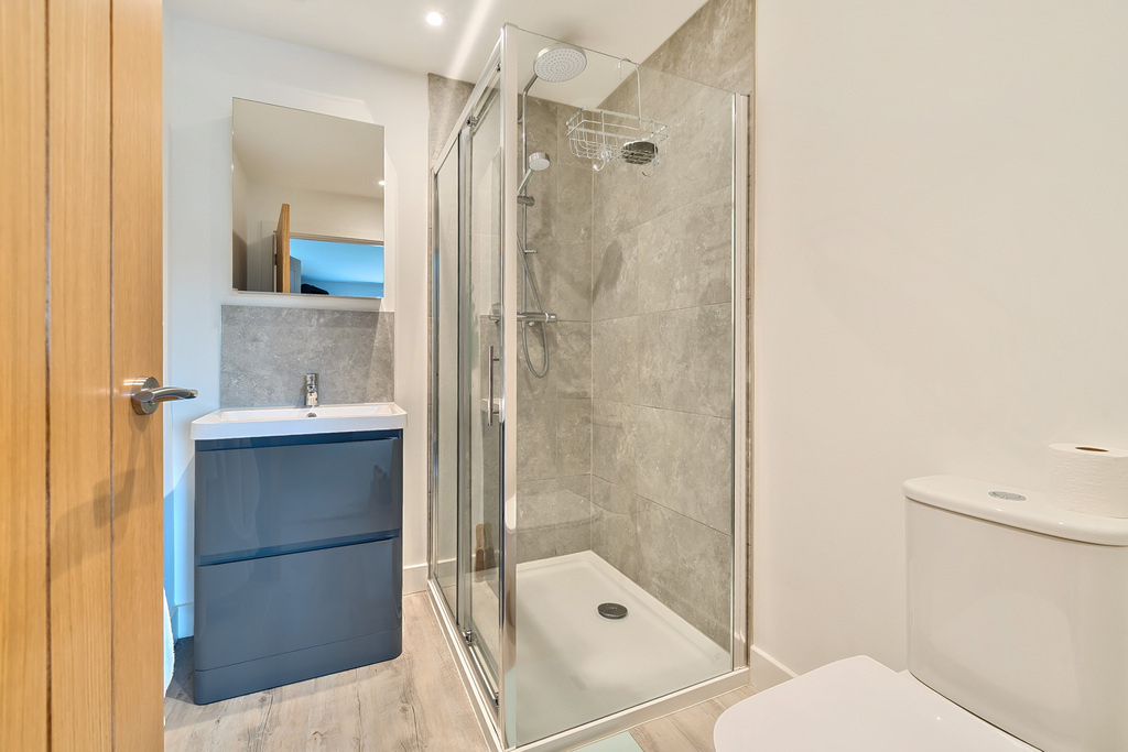 There are two well-proportioned double bedrooms, including a principal bedroom with a modern en-suite shower room featuring a walk-in shower. A third bedroom, ideal as a single room or home office, and a beautifully appointed family bathroom complete the accommodation. The bathroom includes a bath, walk-in shower, WC, and washbasin with modern fittings.
