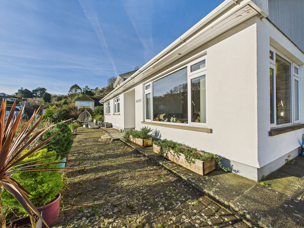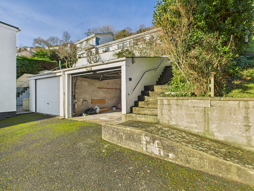 Access is via a private driveway from West Looe Hill. From the garage, a stepped pathway leads up to the front terrace and main entrance.