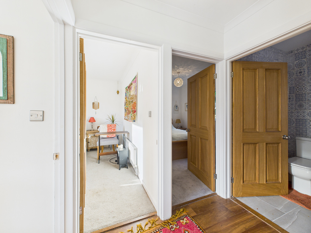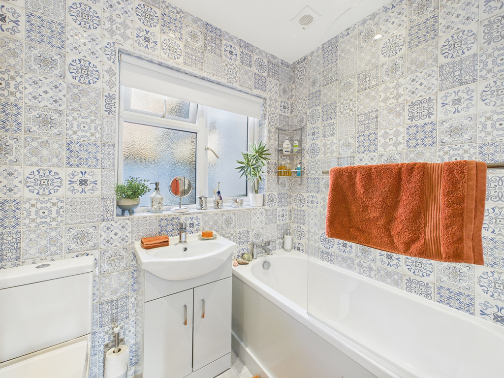 Leading off the main hallway are three further double bedrooms. Two are positioned to the front of the property and enjoy sea views over the front patio, while the third is located to the rear, overlooking the garden. These bedrooms are served by a modern family bathroom.